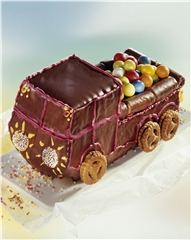 Für den Teig die Butter mit Salz, Zucker, Vanillezucker und Zimt schaumig rühren. Nach und nach die Eier unterrühren. Die geriebene Schokolade mit Nüssen, Mehl und Backpulver mischen und ebenfalls unterrühren. Den Teig in die Form geben und in 40-50 Minuten goldbraun backen. Den Kuchen in der Form etwas abkühlen lassen, dann auf ein Kuchengitter stürzen und völlig erkalten lassen. Für die Lastwagenform nach etwa einem Drittel Länge den Kuchen bis fast zur Hälfte einschneiden und die "Ladefläche" abschneiden. Die Kuvertüre mit der Butter im Wasserbad schmelzen und den Lastwagen damit vollständig glasieren. Rund um die Ladefläche die Waffelröllchen in die feuchte Glasur legen und auch noch glasieren. Dann die Schokoladenplätzchen als vordere Scheinwerfer, die Gummibärchen als Rücklichter und die Marmeladeplätzchen als Räder ebenfalls in die Glasur drücken. Den Lastwagen trocknen lassen. Den Puderzucker mit dem Zitronensaft zu einer spritzfähigen Glasur anrühren, nach Belieben teilen und jeweils verschieden einfärben. Mit Hilfe einer Spritztülle (z. B. Gefrierbeutel mit abgeschnittener Ecke) die "Konturen" des Lastwagens aufspritzen und ausgarnieren. Den Kuchen bei Zimmtertemperatur ganz trocken werden lassen. Vor dem Servieren die Kaugummigkugeln auf der Ladefläche verteilen. Nach Belieben kann der abgeschnittene Kuchen in Würfel geschnitten und ebenfalls glasiert, ausgarniert und als "Ladung" verwendet werden. |
