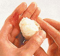 Sushi umdrehen, behutsam von oben mit den Fingern in eine